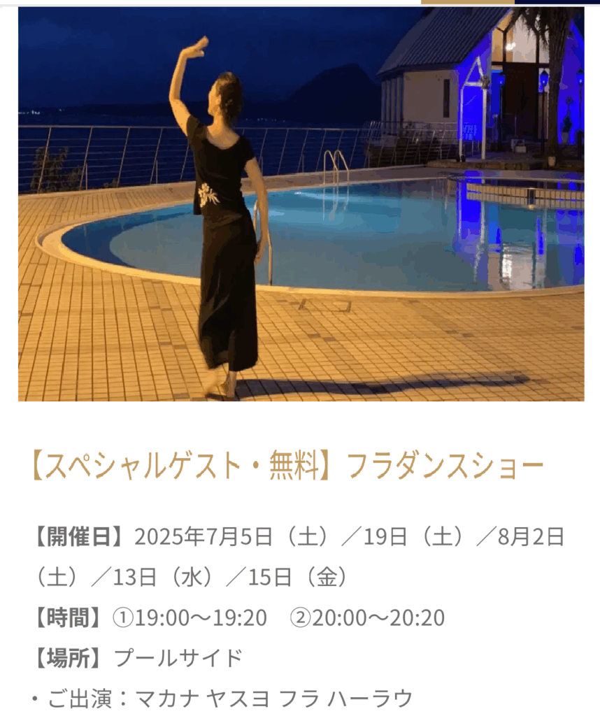 「Summer Program 2025」 館内イベントにハーラウで出演致します 幅広く楽しめるイベントもあります!サマーリゾートを満喫してくださると嬉しいです(^^)/※宿泊者様限定                    2025年7月5日/19日・8月2日/13日/15日 1部PM19:00~・2部PM20:00~ 「フラダンスショー」詳細はこちらをクリック下さい https://grand-mercure-beppubay-resortandspa.jp/plan/summer-program2025-2/
